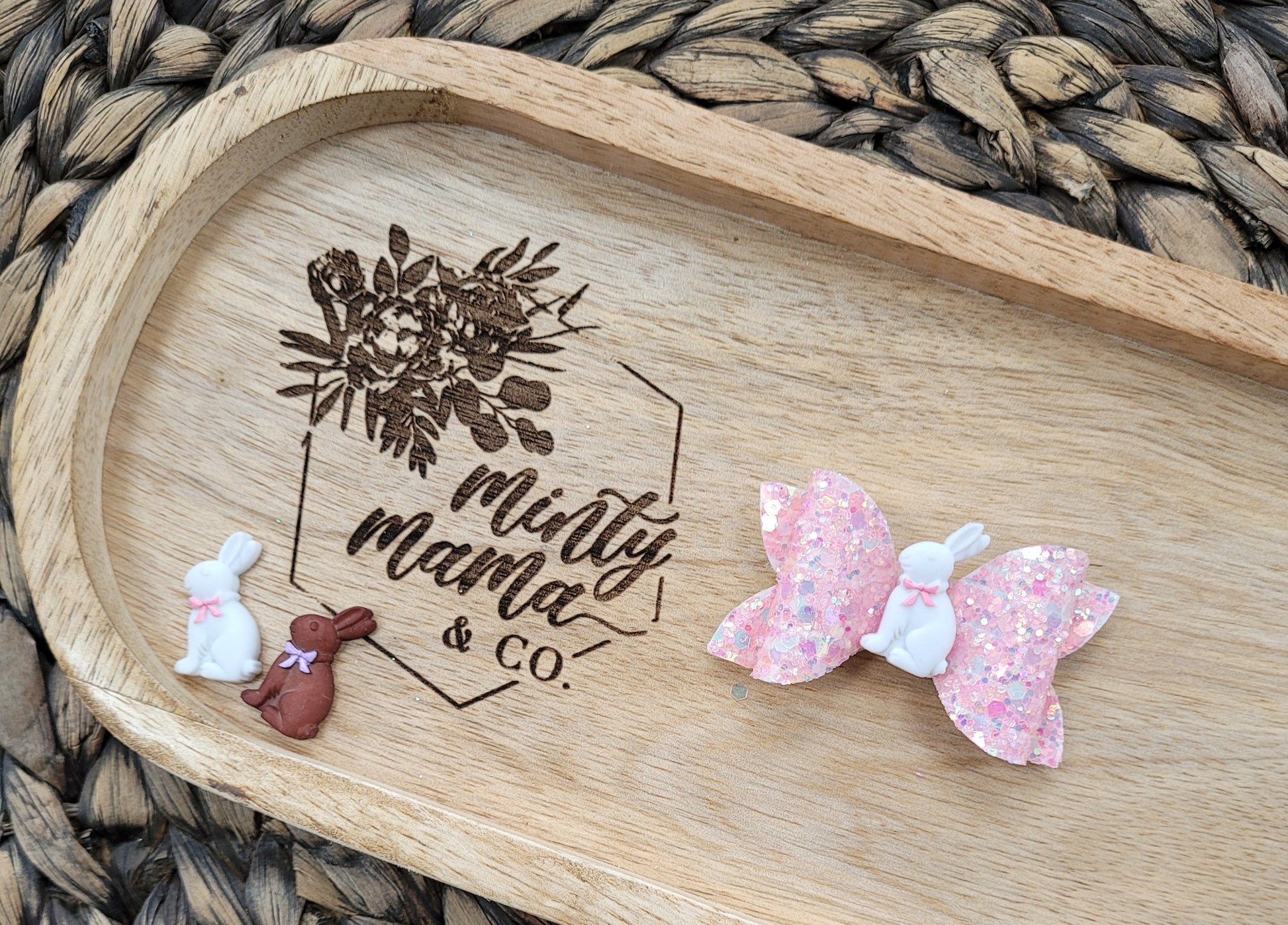 Made with a premium glitter canvas center and strongly adhered bunny applique. **Comes with one itty bitty bow, buy 2 for sweet piggies!**