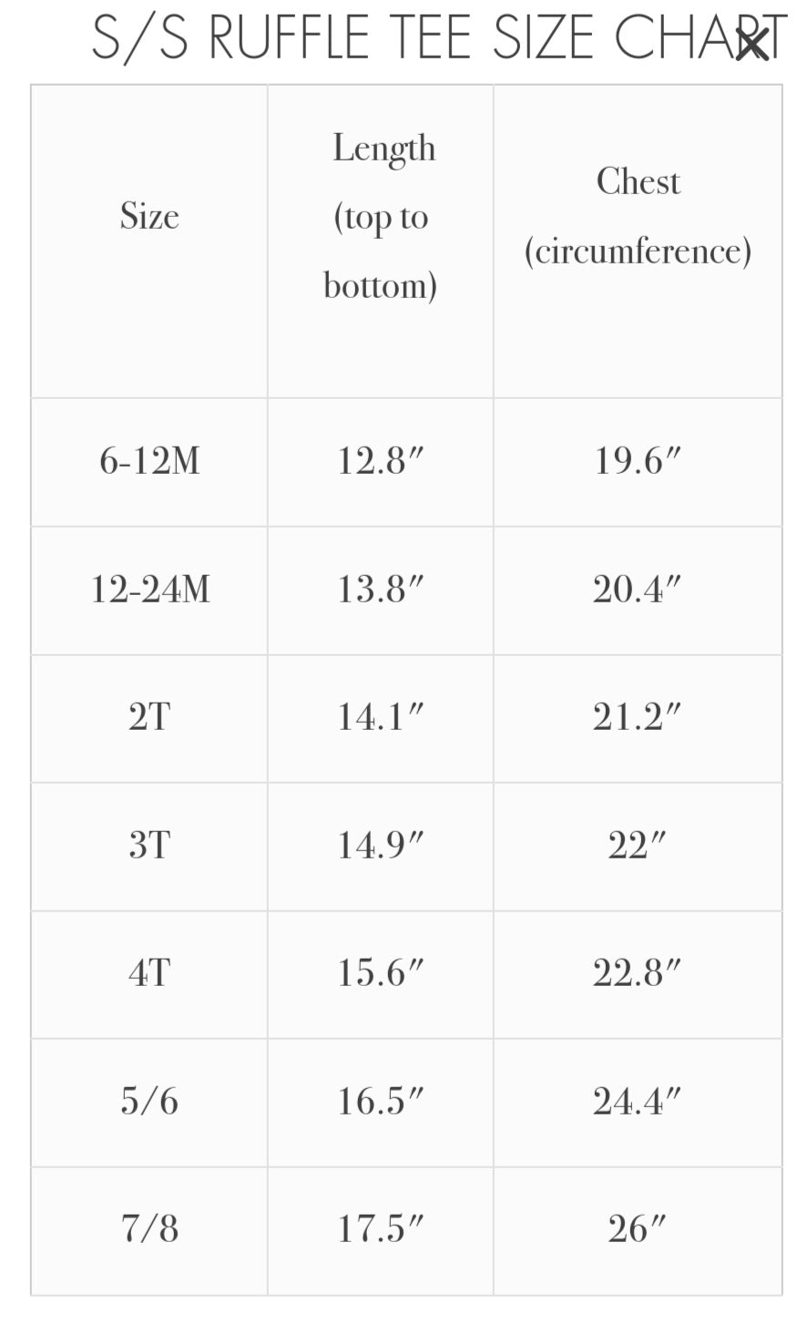 Our ruffle tee is perfect with skirts, shorts, leggings, or layering under pinafores!