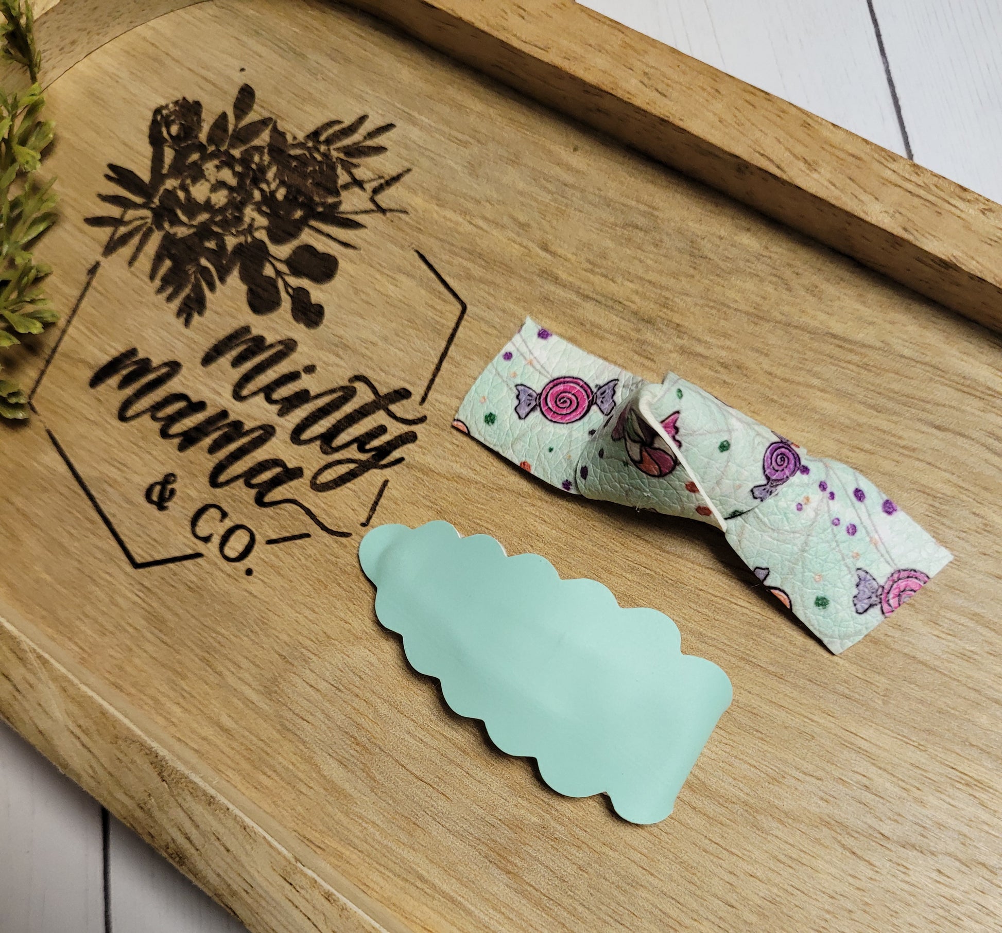 This 2-pack will include one camping print faux leather and faux leather coral pink snap clip.