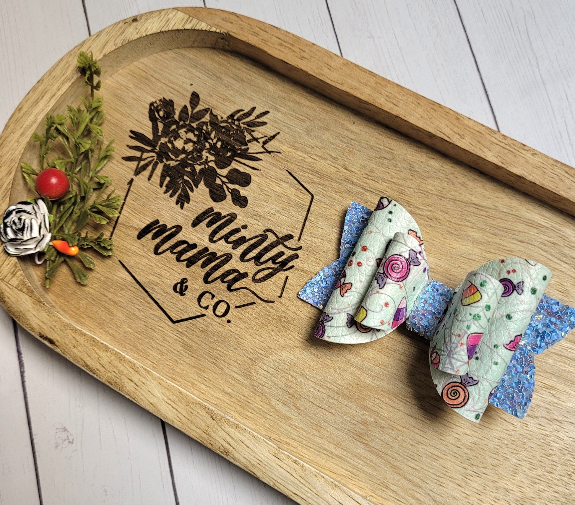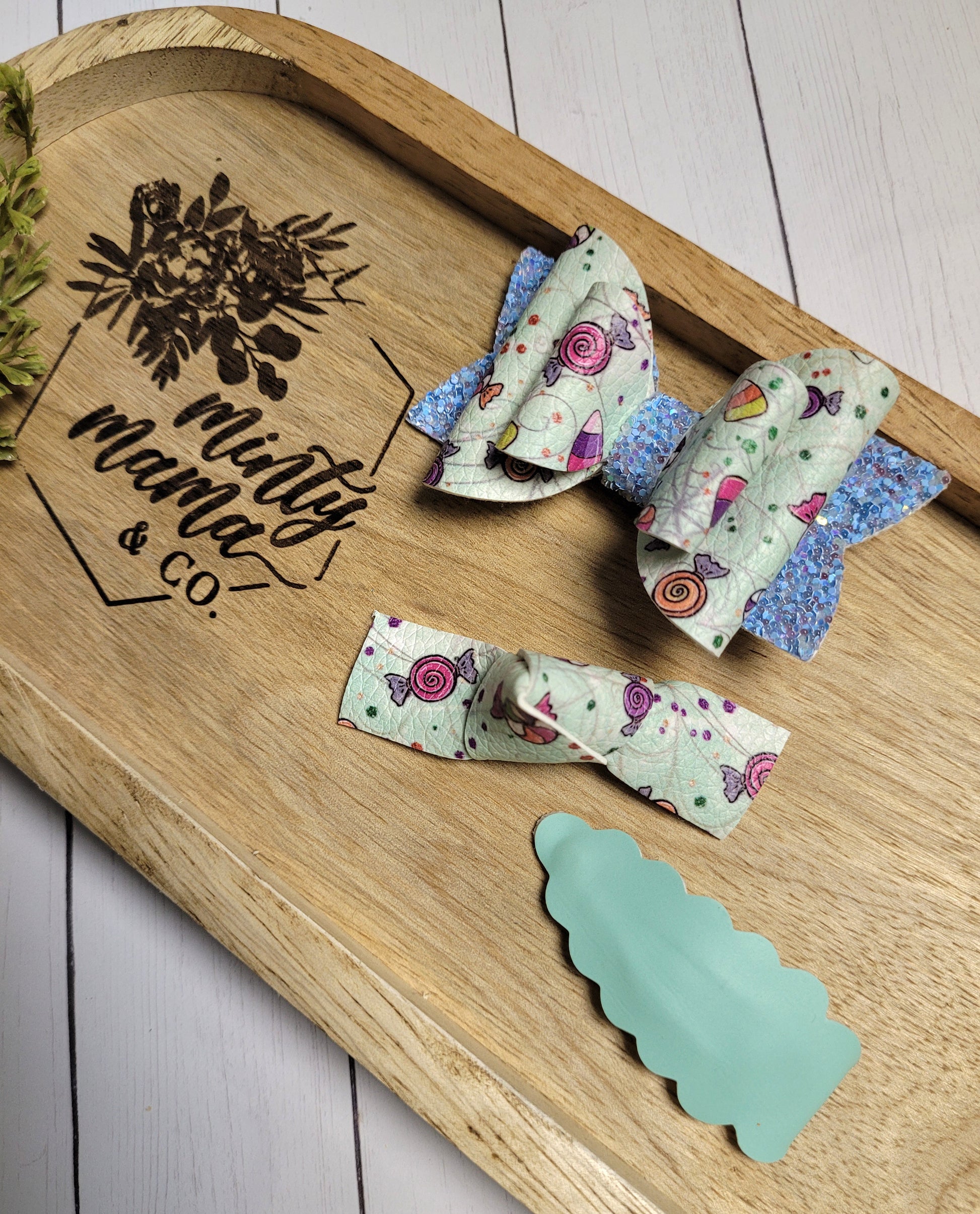 Made with a textured vegan faux leather and GLOW glitter canvas (base of bow).